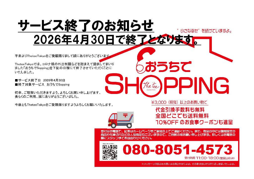 TheteeTokyoでは、コロナ禍の外出制限などを踏まえて提供してまいりました「おうちでSopping」を下記の日程にて終了させていただくことにいたしました。